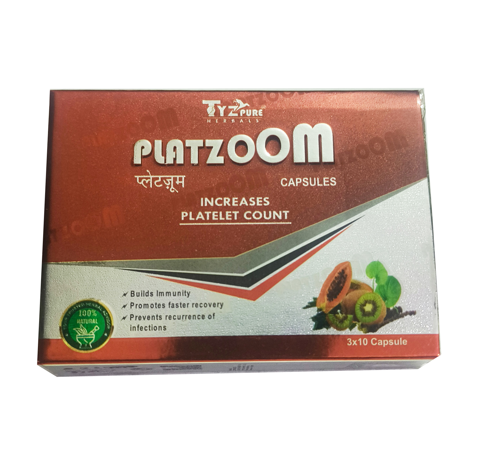 PlatZoom Capsules are a powerful Ayurvedic formulation designed to naturally enhance platelet count and support immunity. Enriched with papaya leaf, giloy, and tulsi, it helps in faster recovery from viral infections like dengue, chikungunya, and flu while revitalizing overall health.
